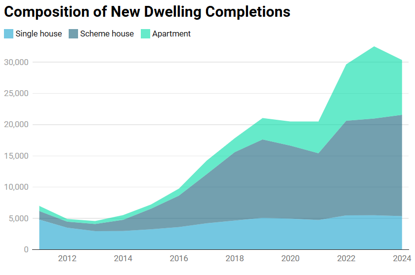 It would seem that the drop in 2024 is due to a small drop in the number of completed apartments. The composition of completions is given here in Figure 2. It shows how the increase in the number of dwellings completed were either scheme houses or apartments. The number of individual houses built is quite limited, only marginally more houses are built today compared to 2012, when the vast majority of new dwellings were single houses.