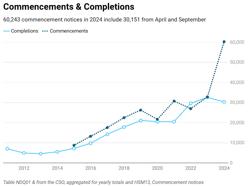Perhaps there is merely a glut of units due to be completed. If we look at commencements it would suggest that there are lots more on the way. However, these commencements include 30,000 from two specific months, April and September coinciding with incentives such as development levy waiver and Uisce Éireann connection charge rebate. These perhaps include the glut of projects that would have had planning permission for a couple of years. It's unclear when they will actually be completed given that perhaps they commenced before they were actually ready to do so.