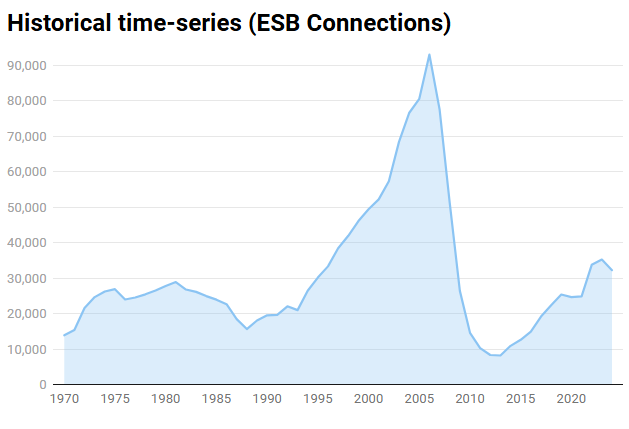 Of course there are plenty of established reasons for this. But it does raise the question, how was it so much easier for construction to rise so much higher in the 19990-2009 period. One of the arguments for a lack of building today concerns how process of planning permission has stymied development, something that the Planning and Development Act 2024 is intended to resolve.