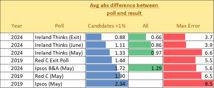I'd normally refrain from this sort of 'accuracy' analysis because in reality polls and outcomes can diverge for a whole host of reasons outside of the control of the polling firm. And such analysis doesn't necessarily improve the quality of public opinion polling rather it encourages ad-hoc, unjustified adjustments. In the past I had heard from a senior academic colleague of how one polling company (which will remain nameless) used to apply an additional constant to a major political party in Ireland.