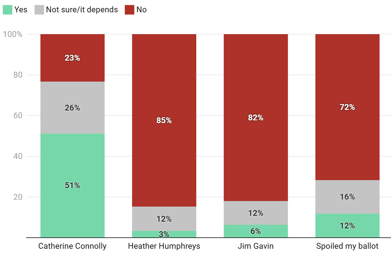 Meanwhile, opposition to such an alliance is high amongst voters of candidates that were backed by government parties. A vast majority of Humphreys and Gavin voters (85% and 82% respectively) stated they wold be unsupportive.
