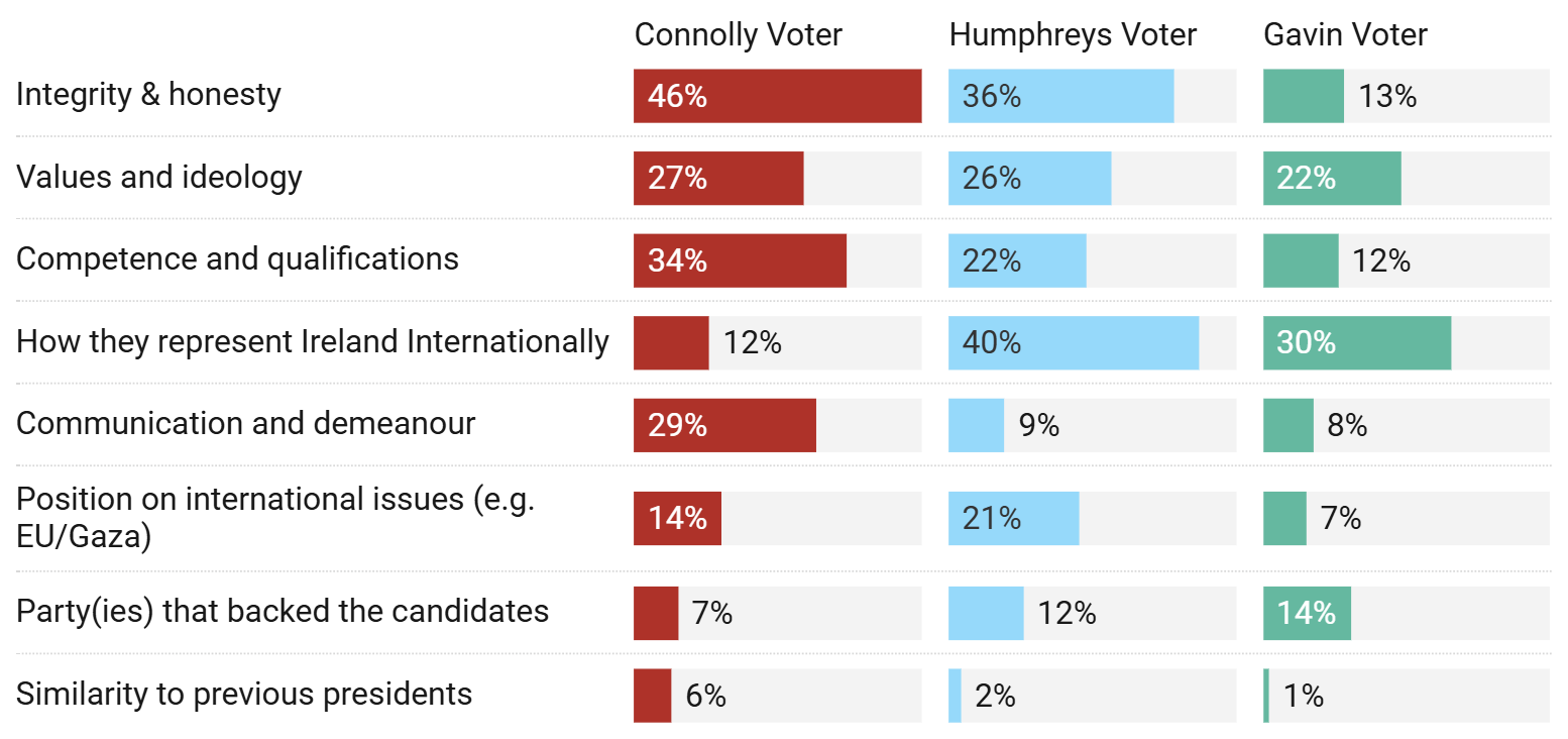 Connolly voters relied on Integrity & Honesty, Competence and Communication skills. Humphreys voters more likely to focus on how the candidate represented Ireland internationally.